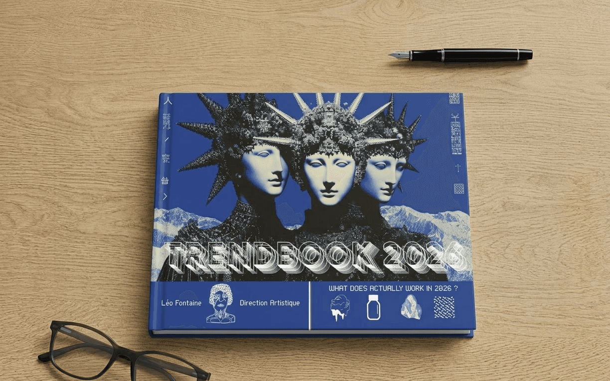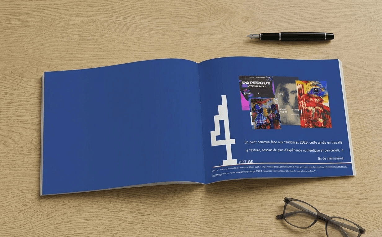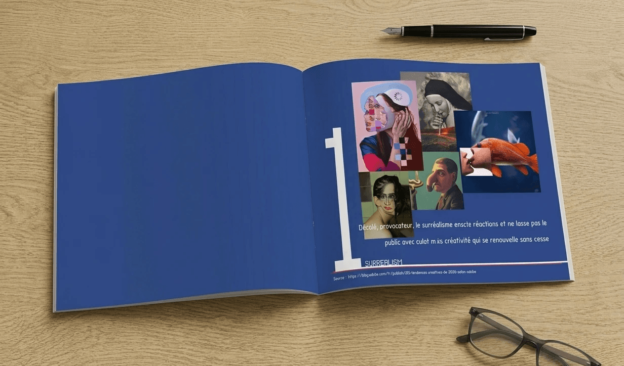 Analyse prospective des courants visuels de 2026. Ce carnet de tendances explore l'équilibre entre surréalisme et géométrie simple, tout en valorisant le mixed media. J'ai particulièrement travaillé sur la recherche de textures authentiques pour contrer l'aspect parfois trop lisse du numérique. C'est un exercice de veille stratégique visant à définir une esthétique où la matière et l'épure se rencontrent pour créer des directions artistiques innovantes.